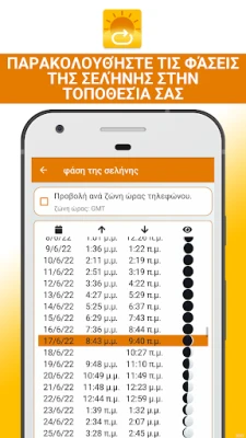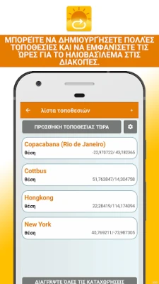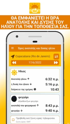 Δείτε τις ώρες ανατολής και δύσης του ηλίου για την τρέχουσα τοποθεσία σας. Εξερευνήστε τις ίδιες πληροφορίες για οποιοδήποτε μέρος του κόσμου και αποθηκεύστε τις αγαπημένες σας τοποθεσίες σε μια εύχρηστη λίστα για γρήγορη πρόσβαση.